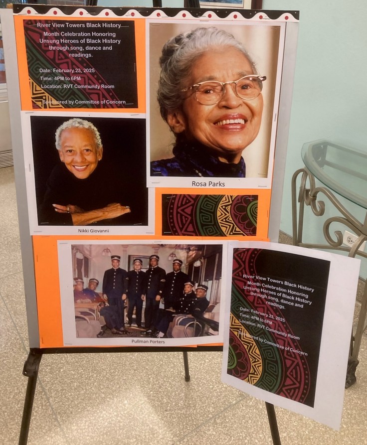 Many, many thanks to the team behind the scenes who refused to go another year without acknowledging Black History at River View Towers: Mercedes Nesfield, Alexis Morton, Patricia Watler-Johnson, Linda Lewis, Orundun Dacosta Johnson, Wonda Graves, Beverly Ward. Gratitude for the artwork donated by Ali Canty, Charlene Davis, Patricia Watler-Johnson, and Tomaisha Ancrum.