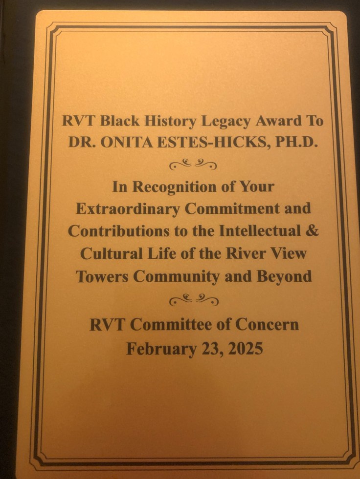 “Big Judy” Eason presented the award to Dr. Onita Estes-Hicks in recognition of her commitment and contribution to the intellectual and cultural life of the River View Towers community and beyond. When asked how Dr. Hicks felt about the presentation she said, “Everything was lovely. I was deeply touched,” and so true to form she added, “I have some ideas for other things we can do here in the building.”