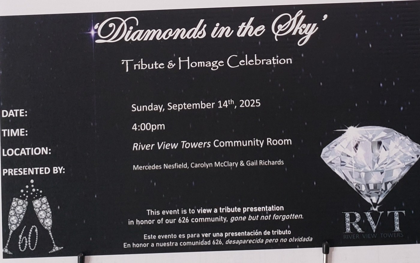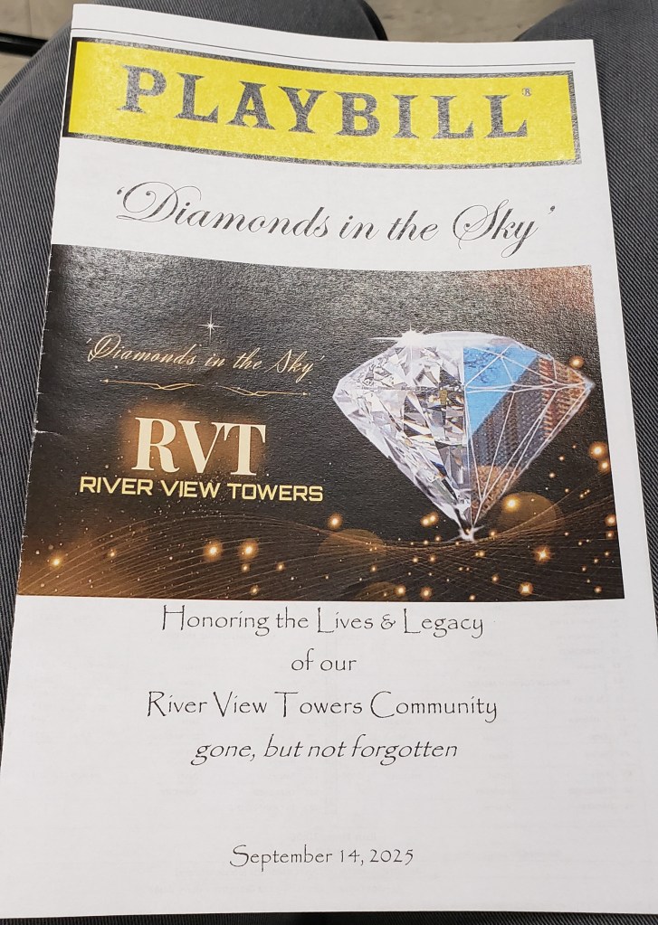 Thank you Gail Richards, Mercedes Nesfield and Carolyn McClary for all the smiles, tears, laughter, and sheer joy of seeing our neighbors and family brought to life for us once again. With ‘Diamonds In The Sky,’ you gave us all a chance to share loving stories and rich memories and continue to celebrate and honor the legacy of River View Towers on its 60th Anniversary.